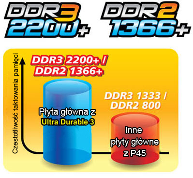 Oferujac pelne wsparcie dla pamieci DDR3 2200+ i DDR2 do 1366+ MHz, seria plyt glownych GIGABYTE Ultra Durable 3 pozwala uzytkownikom osiagnac wyzsza czestotliwosc pracy pamieci przy nizszym napieciu, a w konsekwencji na uzyskanie wiekszej wydajnosci przy mniejszym zuzyciu energii.
