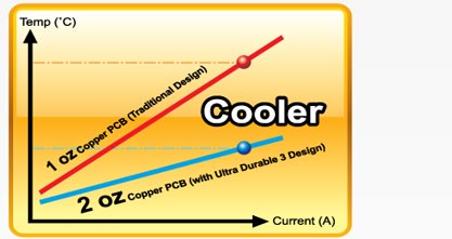 Podwojenie ilości miedzi zapewniło bardziej wydajne odprowadzanie ciepła z krytycznych obszarów płyty głównej takich jak okolice CPU. Technologia GIGABYTE Ultra Durable 3 umożliwia dwa razy skuteczniejsze obniżenie temperatury pracy w porównaniu z tradycyjnymi płytami. |