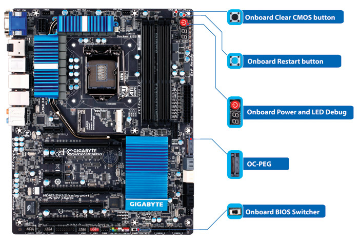 Wyjątkowy wbudowany przełącznik BIOSu pozwala użytkownikowi na łatwe przełączanie się pomiędzy poszczególnymi kościami BIOSu. Znacznie ułatwia to przełączanie się pomiędzy ustawieniami podstawowymi, a tymi do podkręcania oraz umożliwia sprawdzenie nowej wersji BIOSu bez utraty oryginalnych ustawień. Wbudowany przycisk Clear CMOS ułatwia przywrócenie BIOSu do ustawień fabrycznych.